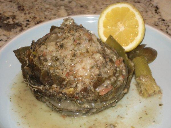 Stuff meat mixture tightly into the artichoke heart and wrap each artichoke separately in wax paper.
